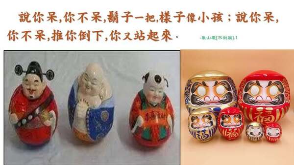 說你呆,你不呆,鬍子一把,樣子像小孩;說你呆,你不呆,推你倒下,你又站起來。念佛人對「彼阿彌陀佛四十八願,攝受眾生;乘彼願力,定得往生」的決定深信,由佛力住持於心,得不退轉,如「不倒翁」之「順教修行,永除疑錯;不為一切別解.別行.異學.異見.異執之所退失傾動。」一心信受釋尊.彌陀,及諸佛所說之了義法。任你推,他搖擺,又回本來。大智若愚,於機法二信不顛倒.不退轉;心念單純如初生兒--不抗拒(隨緣),也不扭曲(不變),無所住而生其心、身娑婆而心淨土,即「不斷煩惱得涅槃分」。